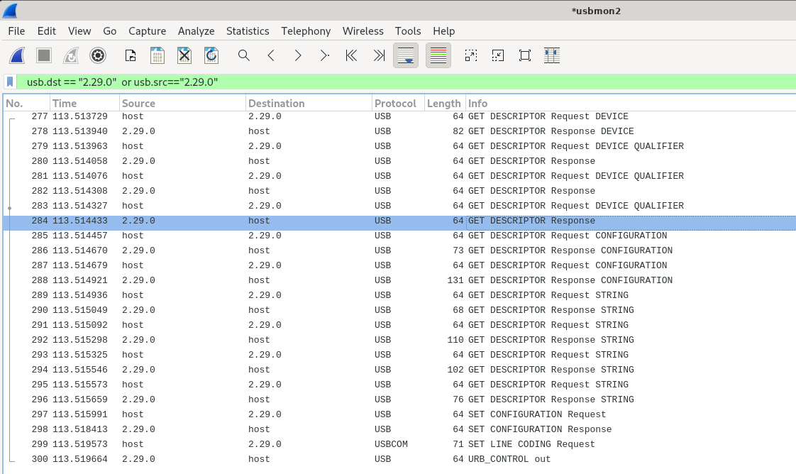 Frame 290: 68 bytes on wire (544 bits), 68 bytes captured (544 bits) on interface usbmon2, id 0