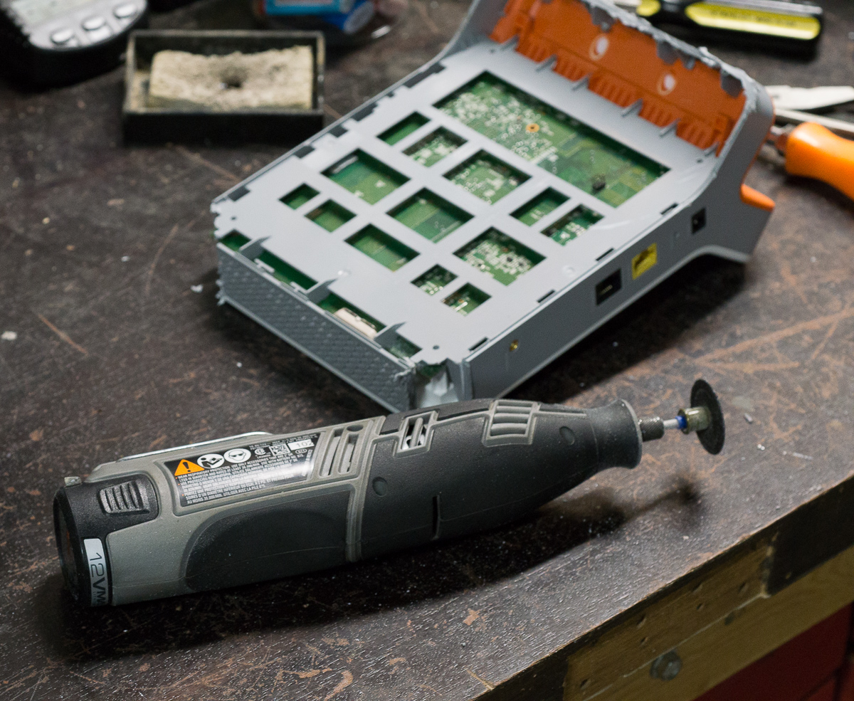 I had no idea about the screws and had no qualms about destroying the case, so I began by using a cutoff disk in my trusty dremel tool to saw off the top of the case.