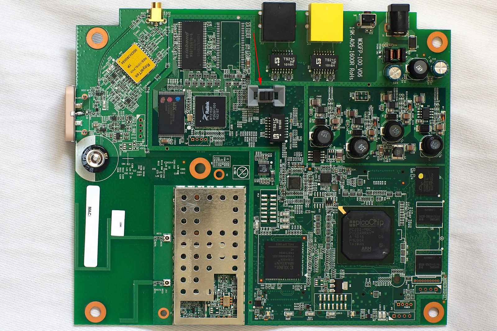 WiFi? - Ralink RT2150F GPS - RoyalTek REB-1315LPNX FPGA - Xilinx XC3S400A SDRAM - Winbond W9812G6IH Flash - MX 29LV320DBTI-70G Baseband+ARM9 Processor - picoChip PC202, based on ARM926EJ-S processor SDRAM - Samsung DDR2 K4T51163QG-HCE6 Flash - Spansion GL512P10FFCR2 Ethernet Transceiver - SMSC LAN 8700c-aeczThe PicoChip PC202 is perhaps the most interesting part on the board. This is an English company making unique mulicore DSP devices. Interestingly there is an ARM logo on the part as well. The ARM 926EJ is an older ARM (arm v5) with an 8-bit "Jazelle" mode. This is from the 1998-2006 era and is pretty long in the tooth these days. On many units, the PC202 has a heatsink mounted on it.