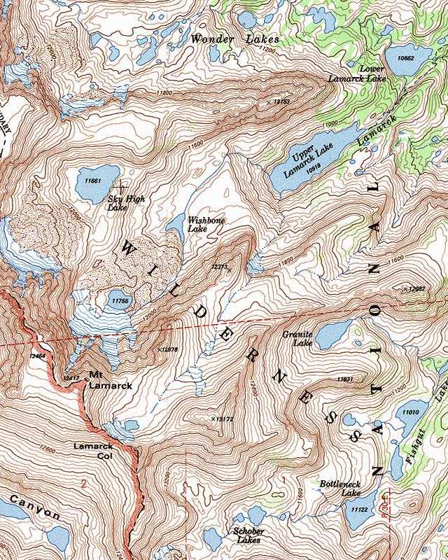 The start of the hike is through pleasant forest up towards Grass Lake (which I never saw, though the trail junction near there was my first stop (a nice meadow area). Then it was up over some switchbacks to Lower Lamarck Lake (10662), which is one of the most beautiful spots I can imagine. I wonder what "Wonder Lakes" are like, given their name and the beauty of Lower Lamarck Lake. From there, it was up the trail to where the trail fizzles out near Upper Lamarck Lake. This is a nice lake, but kind of tightly jammed into its little niche. This is the departure point for the Lamarck Col backcountry route (no longer a maintained trail, though it clearly once was). I basically just took off across country to the south here. I could see the trail switchbacking up the nose of a ridge to the south, and eventually got on the trail and followed it up and around the nose and then up the little hanging valley to the tiny lake southwest of Mount Lamarck. From here the issue is the snowfield on the north facing side of Lamarck Col. I climbed up the snow, ice and giant snowcups, which was not the best route (though it worked out alright). The best thing would be to stay on the left (southeast) side of the snowfield on the rocks, then traverse across the top to the Col. The Col itself has a fancy sign and the trail on the southwest side is a very well defined set of switchbacks. This marks the entry into Kings Canyon National Park.
