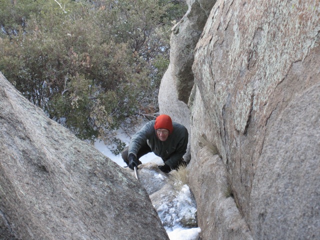 The next day was clear and cold and we took off for the summit. There are a myriad of superfluous ducks and markers along the way, which wanders among cliffs and crags. There would have been another fine campsite higher amidst the rocks, and perhaps it will serve for another time. The actual summit crag requires some rock climbing. I would once have called it class 3, but I now will be more honest and call it class 4. Two ropes were hanging fixed on a crack on the northwest side of the crag. Given that there was ice and snow on the rock, we were grateful for these. The final moves to get on the summit are easy enough, but are done over a 200 foot drop on the east side, and would probably frighten a lot of people. We were on top just before 9:00 AM. This is a truly great summit, absolutely the finest summit in the Catalinas, and one of the best in Southern Arizona.
