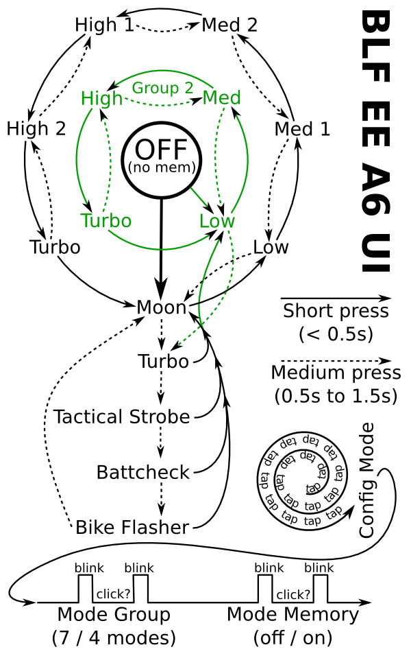 Mode 1 0.4 lumens (moonlight) 3.4 mA 500 hours (20 days) Mode 2 8 lumens (low) 14.5 mA 133 hours (5 days) Mode 3 51 lumens (medium 1) 134 mA 14 hours Mode 4 149 lumens (medium 2) 430 mA 4.5 hours Mode 5 344 lumens (high 1) 600 mA 3.3 hours Mode 6 672 lumens (high 2) 1.07 A 1.8 hours Mode 7 1109 lumens (turbo) 2.48 A 48 minutesRun times of course depend on what battery you use. The times above are based on a 2000 mAh battery. Note that I have not measured these times, I have measured the current draw and calculated the times.