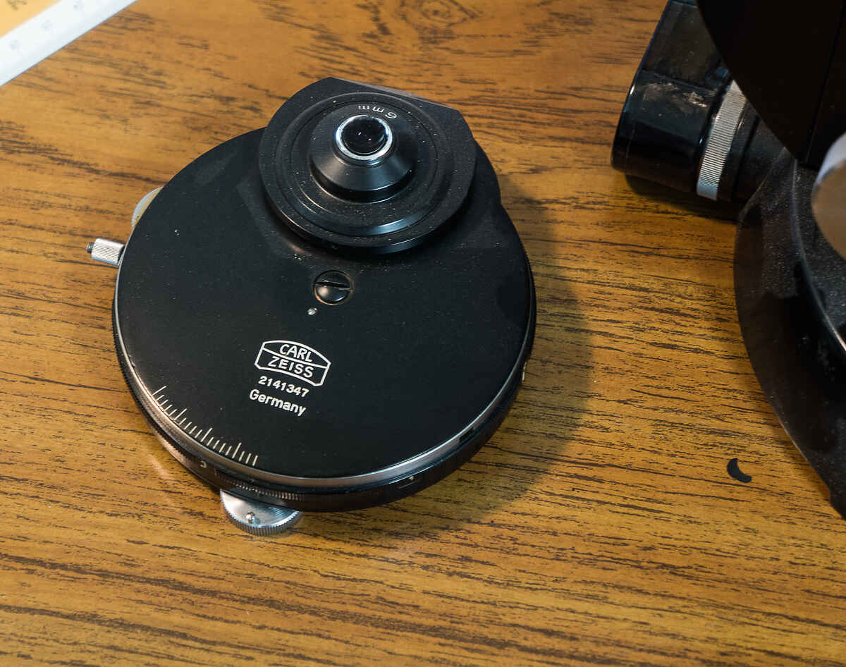 eyepieces Kpl 8x Objectives are marked: Plan 2,5/0.08 160/- 10/0.25 160/- Ph1 Neofluar 40/0.75 160/0.17 Ph2 Neofluar 100/1,30 Oel 160/- Ph3 The Ph1 .. Ph3 markings are in red -- what is this all about? Then there is the big removable condenser gadget. It has a variety of adjustments I wouldn't dare monkey with, and the big disk rotates to settings marked D J 1 2 3 4 5 (i.e. 7 positions are possible). Above the objective turret is a disk that rotates, that is marked: PH 1.0 1.6 2.5 (4 positions).I learn from a listing for a Standard WL (which it describes as a "Research Microscope" that the plate above the objectives is what they call an "Optovar". The same listing describes the condensor disk as follows.