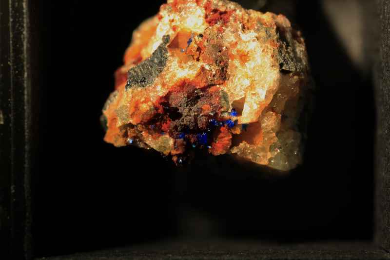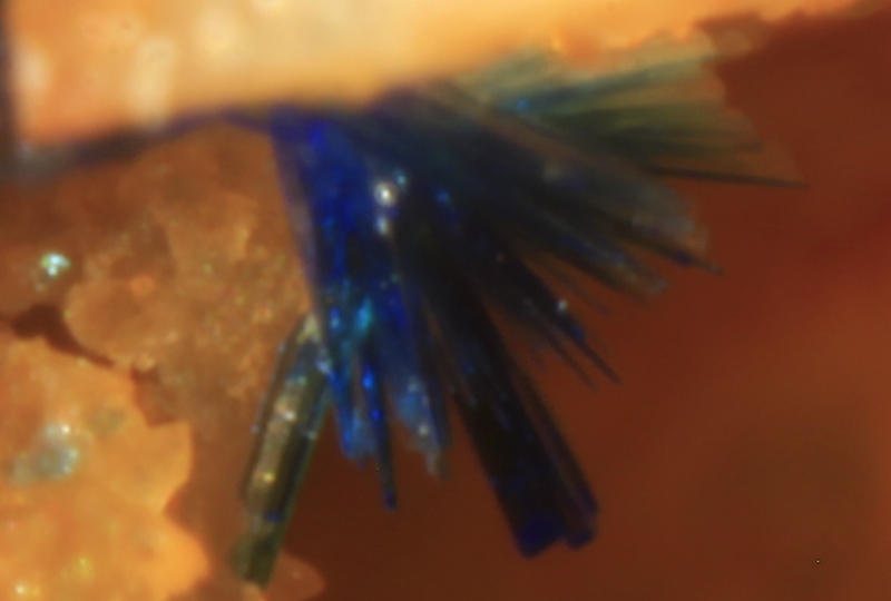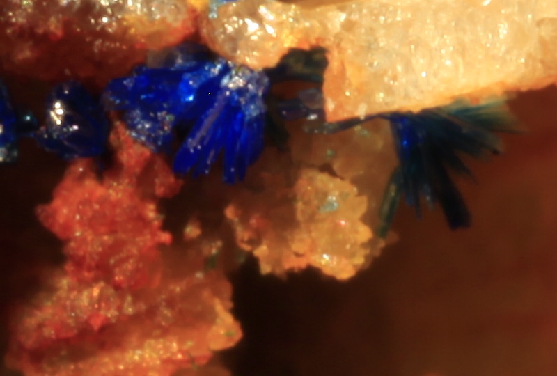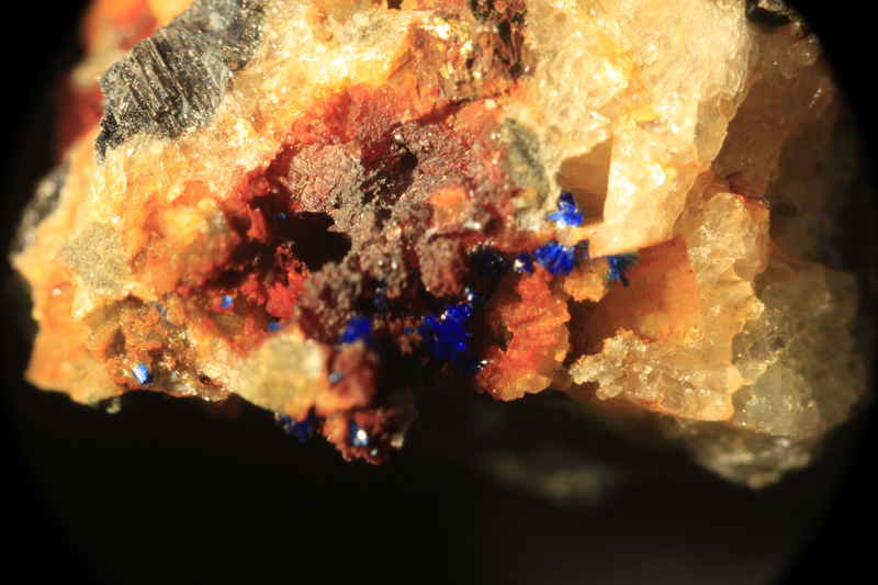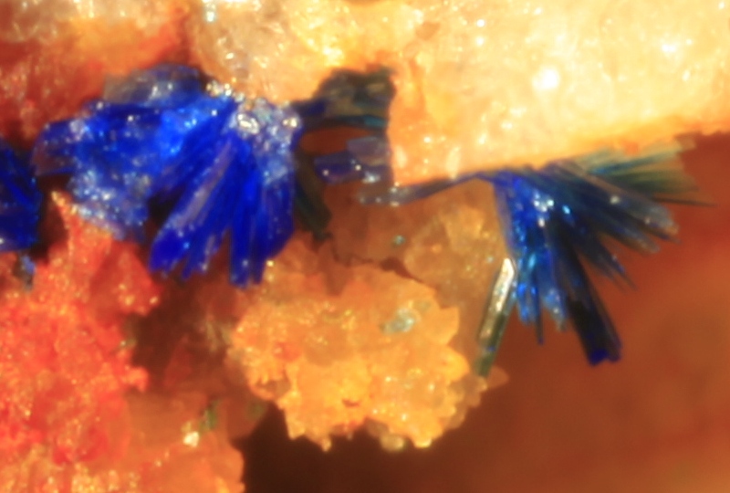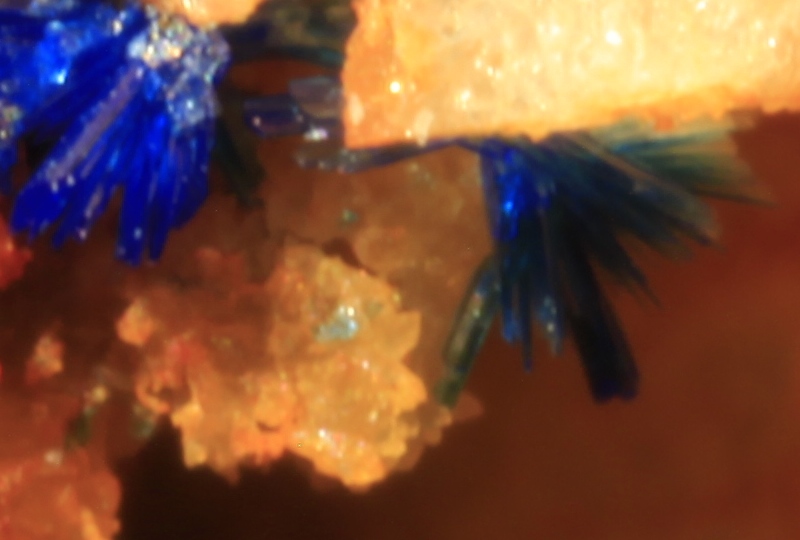 My test subject is a specimen of Linarite from the copper level, Cwymystwyth, Ceredigion, Wales. I am providing this photo of the mount for orientation purposes and to provide an idea of scale for the photos that follow. It is mounted in a "standard" althor size micromount box, so the image width in this shot is about .82 inches across. (This image was taken with the MPE-65 at the 2x setting, but we are getting ahead of ourselves).