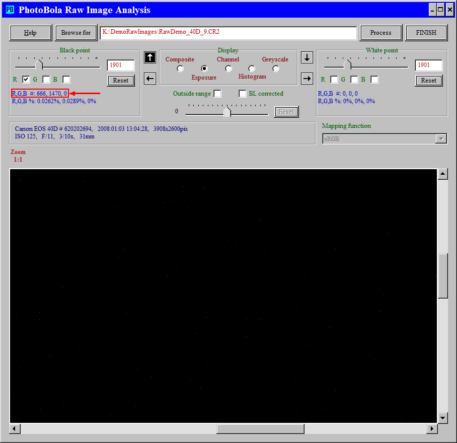 Some cameras offer ISO settings at 1/3 stops as well, but are those "real ISOs"? Let's take an image, shot with ISO 125 and look for a pixel value range, which contains many pixels (the histogram helps finding such ranges). Type in a pixel value in the black point group (don't forget to Enter it) and enter the same value in the white point group as well; after pressing Enter, the control remains in that field. The level 1901 has been selected in both groups. Only red pixels will be displayed at the moment; the color needs to be selected only in the black point group, as that governs the values up to 2047.
