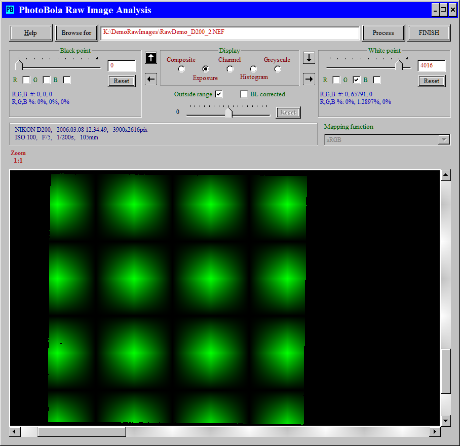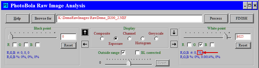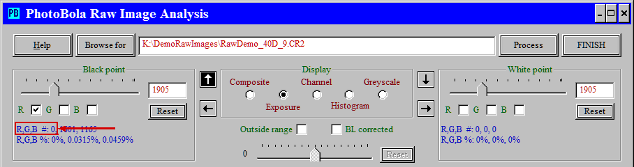 The exposure display offers an additional choice: if the BL corrected checkbox is checked, then the black level corrected pixel values are compared against the selection range limits (this is independent on the black point setting); otherwise the original raw pixel values are used in the selection.