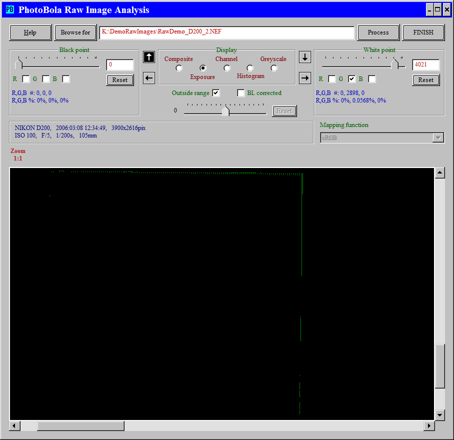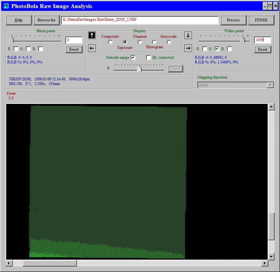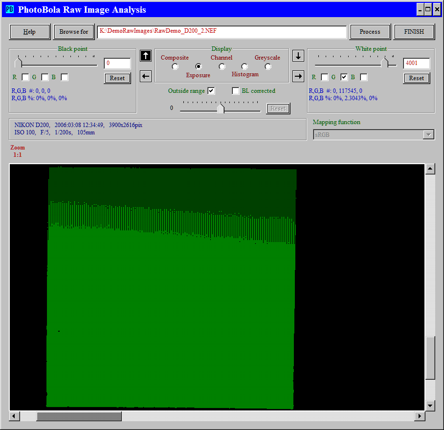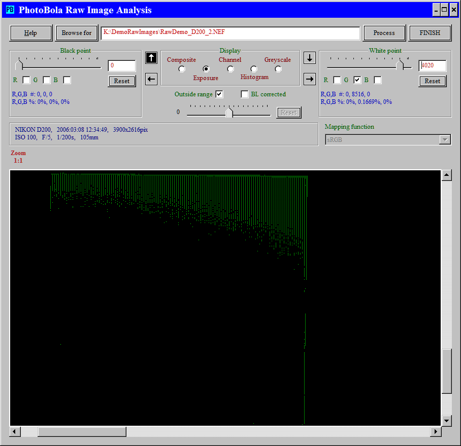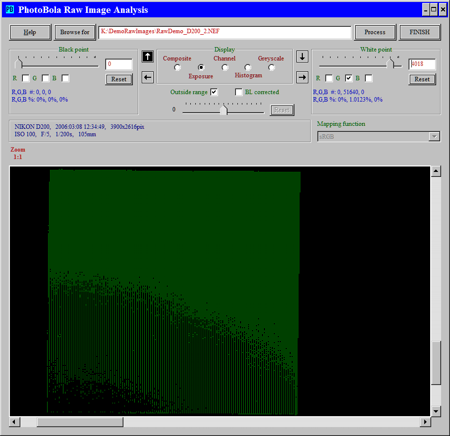 Let's find out, how the clipping occurs with this camera. Outside range is checked, only the green pixels in the higher range are shown.