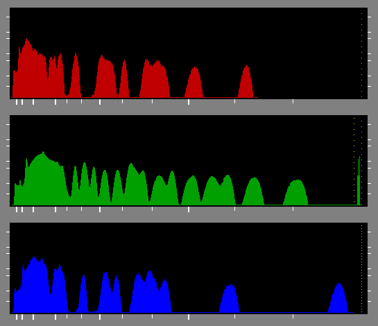 If we keep on stepping through the values, we find that regularly every fourth/fifths value (alternating) is a "gap" in either the red or blue pixels. This indicates, that the ISO 125 values have been created by multiplying the ISO 100 values. There is no visible gap in the green pixel values, because the gaps are alternating between the two green positions of the color filter array block.