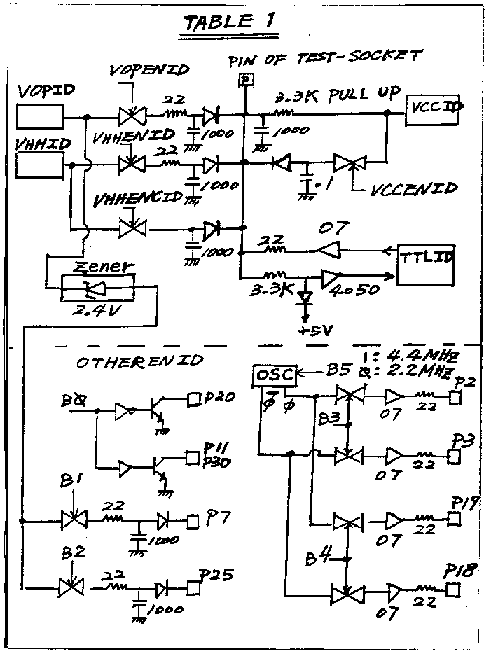 0xe5 - DAC "VOPID" 10.2 to 25.5 volts with 0.1 volt resolution 0xe6 - DAC "VHHID" 5.1 to 15.3 volts with 0.06 volt resolution 0xe7 - DAC "VCCID" 0.0 to 10.2 volts with 0.04 volt resolution 0xe0 - TTl0 40 pins on test socket, TTL control 0xe1 - TTl1 0xe2 - TTl2 0xe3 - TTl3 0xe4 - TTl4 0xe8 - VOP0 40 pins on test socket, VOP control 0xe9 - VOP1 0xea - VOP2 0xeb - VOP3 0xec - VOP4 0xf0 - VHH0 40 pins on test socket, VHH control 0xf1 - VHH1 0xf2 - VHH2 0xf3 - VHH3 0xf4 - VHH4 0xed - VCC0 16 bits of VCC control 0xee - VCC1 0xf5 - VHHEX0 16 bits of "extra" VHH control 0xf6 - VHHEX1 0xef - OTHER 8 bits of "other" control 0xf7 - LED (bit 3 controls the "GOOD" led