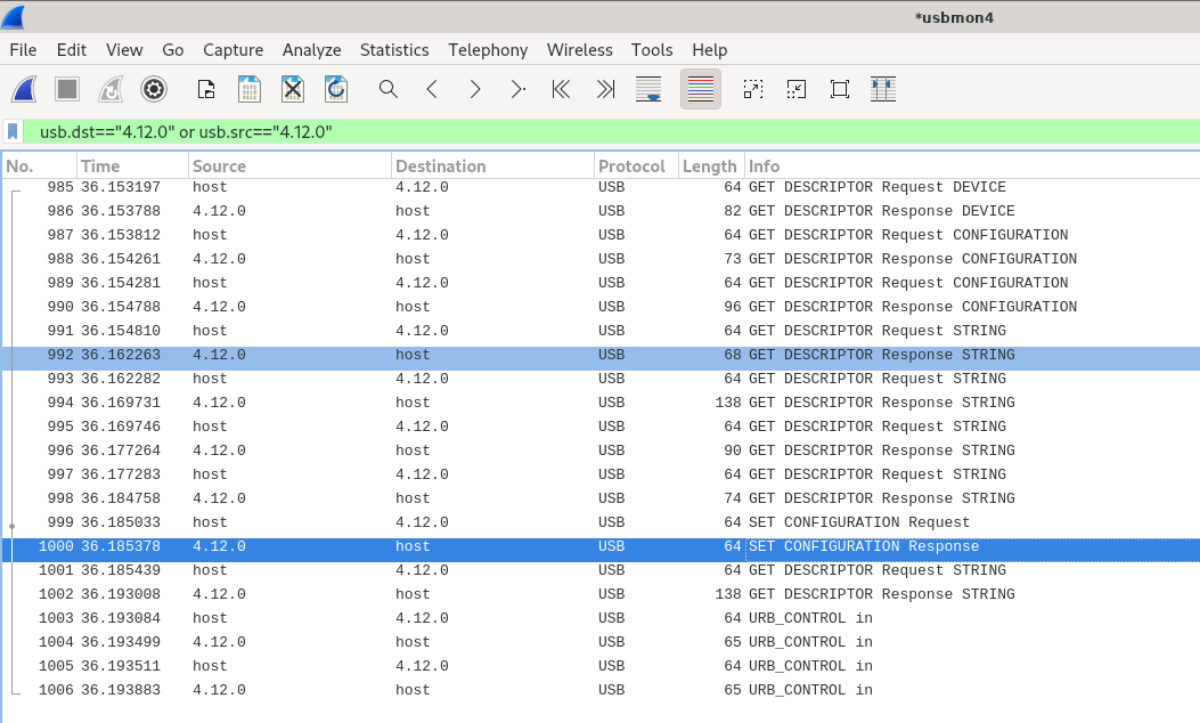 usb.dst=="4.12.0" or usb.src=="4.12.0"I see 22 packets exchanged during enumeration. It will be a little painful, but I intend to transcribe the data for all 11 responses.