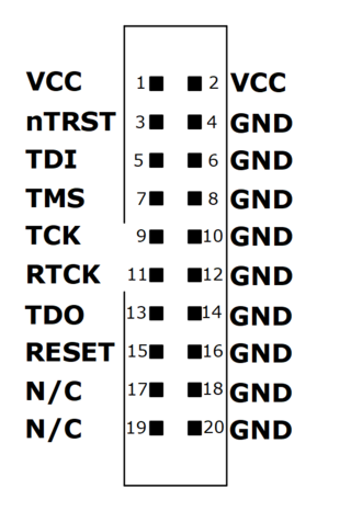My device has grounds on all the even pins (except pin 2) as shown. Pin 2 could deliver 3.3 volts to the target, except that I have disabled this by removing a jumper on the PCB. This leaves the 10 odd pins: